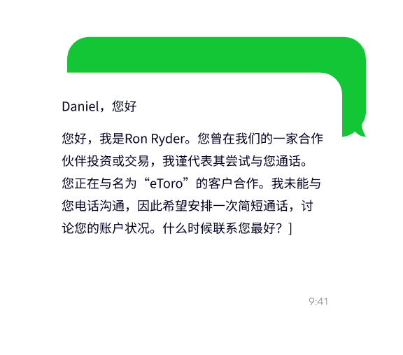 - 我们绝不会通过第三方与您沟通账户事宜。我们只会委派 eToro 官方代表与您联系。