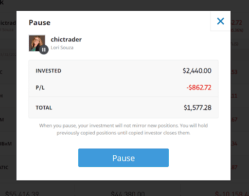 暂停跟单这项功能允许您停止跟单交易者,而无需实际平仓所有当前建立的头寸。
