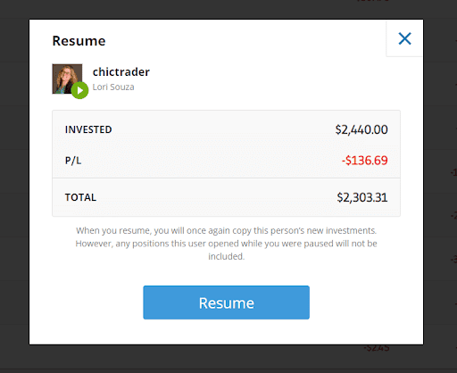 - 您可以随时通过转到投资组合页面并点击“恢复跟单”来恢复跟单关系。